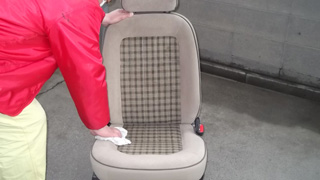 シート生地専用の溶剤をまんべんなく吹きつけ、汚れを浮き上がらせます。